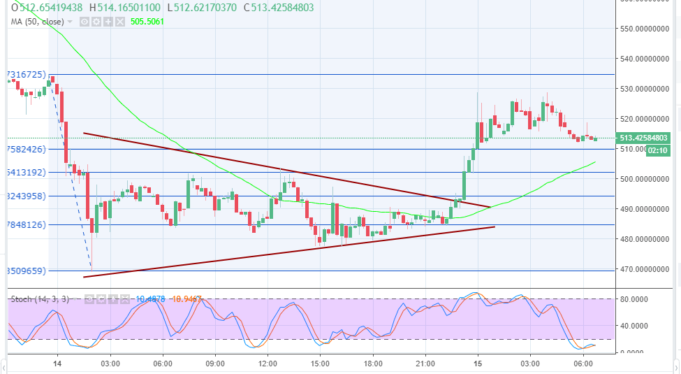 In the past couple of days, investor witnessed Bitcoin Cash violating support areas to the extent of trading below $500. In fact, BCH/USD formed a path heading to $470, but fortunately found a stop at $472 before bouncing back up. The trading yesterday saw a brief recovery amid the bear pressure above $480 as well as $490 resistance lines. It broke above the 23.6% Fib retracement level with the last swing high of $534.67 and a swing low of $469.12.
