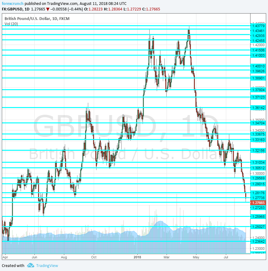 Pound/dollar lost ground on a daily basis and the losing streak is now seven consecutive trading days of falls. The low point was 1.2723.