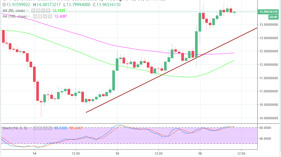Another pullback broke out and Ethereum exchanged hands above $12.00 and $12.50. The listing on Coinbase consumer increased the traders’ positive sentiments on ETH, which led to another spike in two bullish successive engulfing candles. ETH/USD retraced above the broken support at $14.00 and formed a high at $14.23.