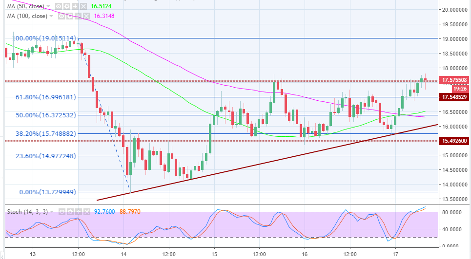 The price is, however, still range bound between the upper limit at $17.51 and the lower limit of $15.49. The trading today has been very progressive with NEO rising over 9% on the day. The 61.8% Fib retracement level with the previous swing high of $19.01 and a low of $13.72 at $16.99 limited the gains during Thursday trading sessions. NEO corrected lower but the trendline support which also coincides with the 38.2% Fib level stopped the slide.