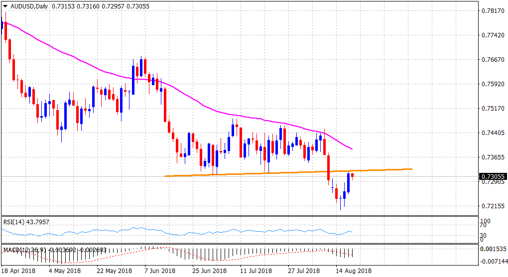 Momentum beyond the mentioned barrier is likely to accelerate the up-move and assist the pair to aim towards reclaiming the 0.7400 handle, 50-day SMA, with some intermediate resistance near the 0.7345-50 region.