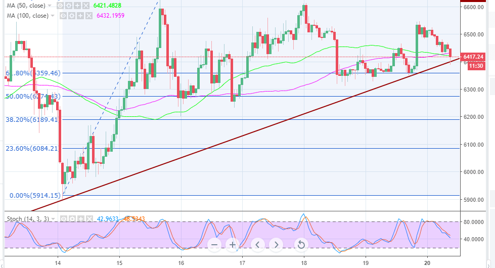 At the time of writing, BTC/USD is testing the short-term support at $6,400 coinciding with the trendline support. If this support is broken, the 61.8% support will come in handy. The next support target at $6,300 is strong enough to stop extended declines.