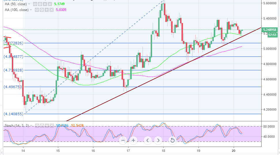 The uptrend broke above $5.40, but the move was short-lived by the bears regaining control. EOS came into contact with $5.6 but embarked on trip downstream again. The downside corrections smashed past $5.00 support but the declines slowed at the 50% Fib level. EOS is currently trading above $5.00 while supported by the 100-day moving average on the hourly chart. The buyers are looking forward to breaking above the key resistance at $5.6. A support above this level will allow the bulls to curve a path to $6.0 and eventually $7.0.