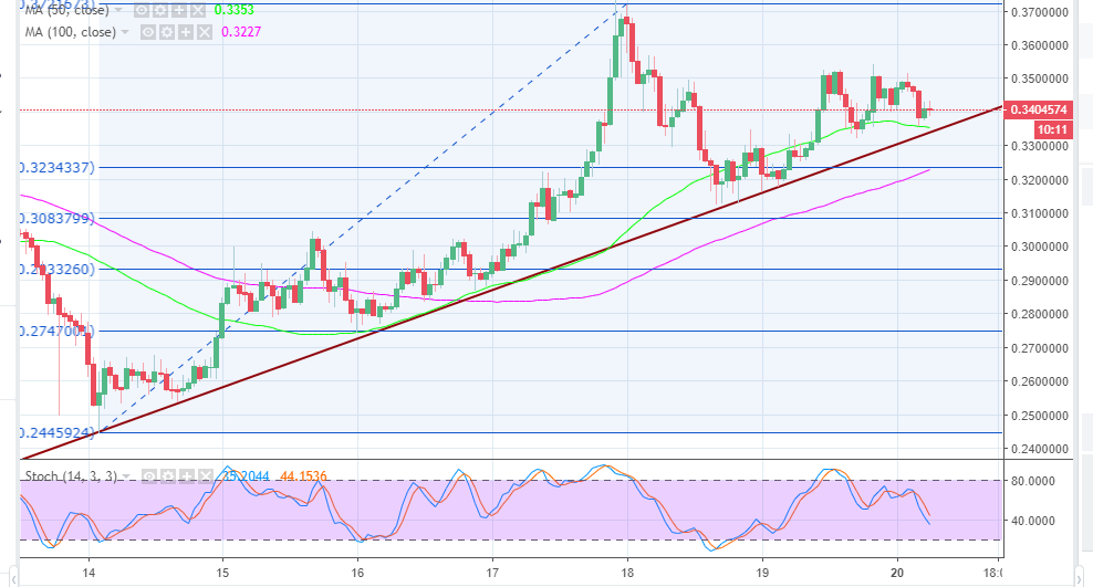 The price is, however, immediately supported by the 50 hourly simple moving average. In addition, the trendline support has been vital to the buyers since the uptrend commenced last week. Another short-term support at $0.33 will prevent declines in the vent the trendline support gives in but the stronger support lies at $0.29 – $0.30.