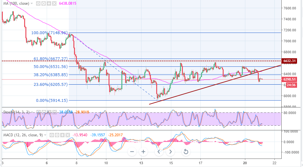 - Bitcoin bullish trend turned bearish on failure to sustain above $6,600 trimming gains towards $6,200 support.