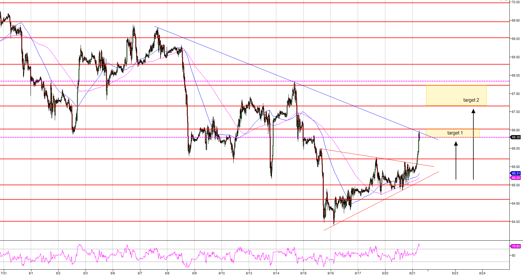 - Bulls broke to the upside from the triangle compression pattern and reached target area 1 in the 66.30-66.53 zone. It is now reasonable to expect some consolidation. If the bearish trendline (blue) is cleared, bulls next objective is to drive the market to target 2 in the 67.16-67.72 zone.