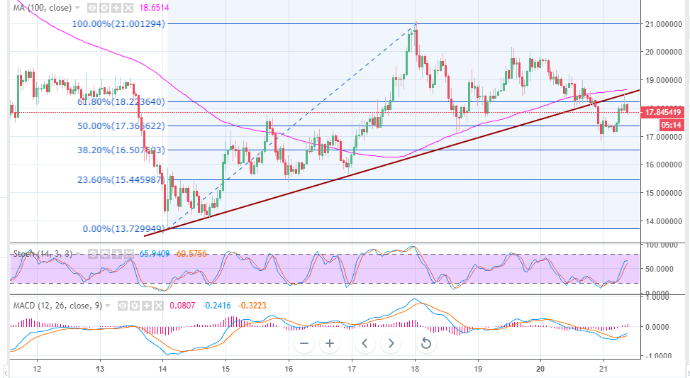 The declines extended to the support at $17.00, before bouncing back up at the opening of the session on today, Tuesday 21. NEO corrected a little lower during the Asian trading hours, although the buyers pushed for higher correction during the European trading hours. NEO price upside is capped at the 61.8% Fib level while the trendline resistance will be a significant hurdle.