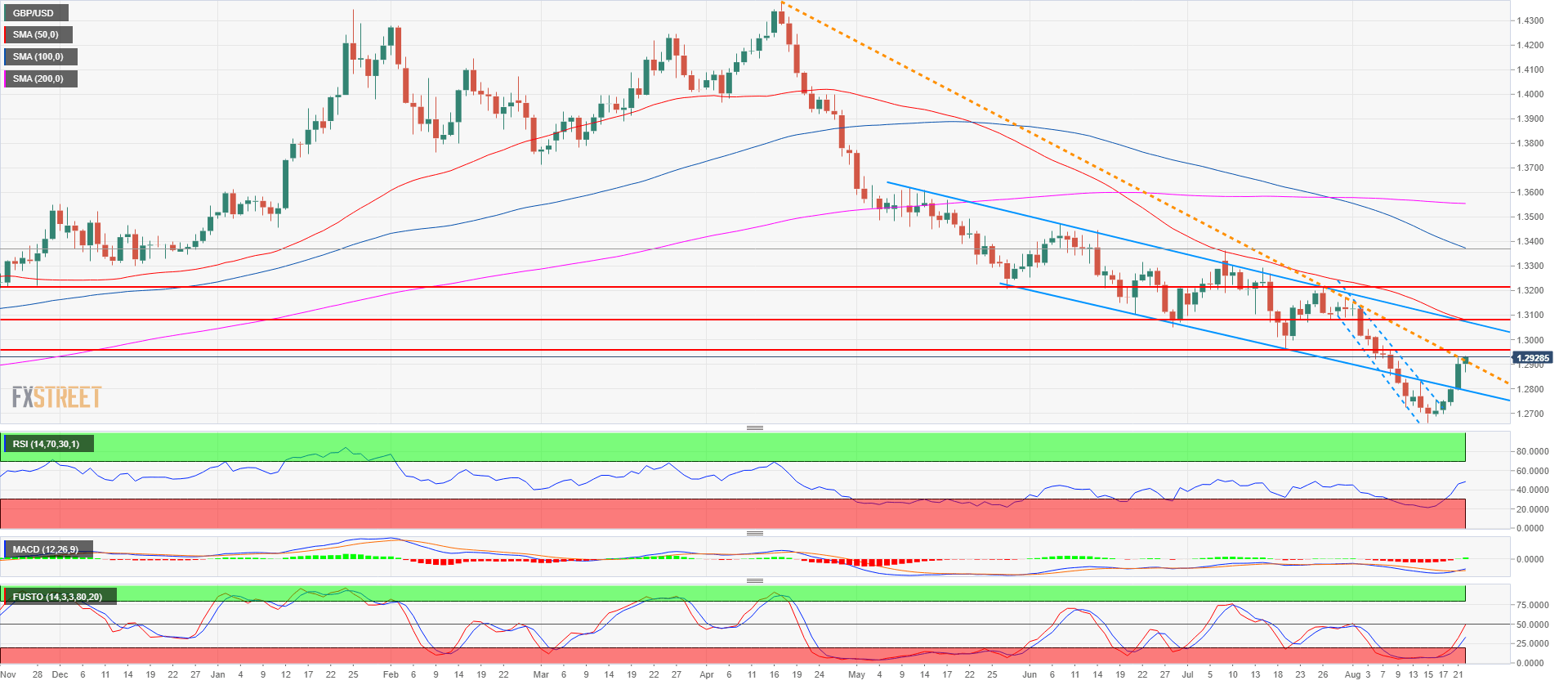 - GBP/USD bulls are now busy trying to break above the multi-month bear trendline from mid-April. Nothing indicates that the bullish move should abate any time soon. The daily Relative Strength Index (RSI) is rising from oversold condition now at about 48, the Moving Average Convergence Divergence (MACD) is bullish and the Full Stochastics Oscillator is rising without being in overbought territories. All indicates that bulls have what it takes to revisit the upper trendline (blue). The key bull targets are located at 1.2957 swing low and 1.3082 supply/demand level.