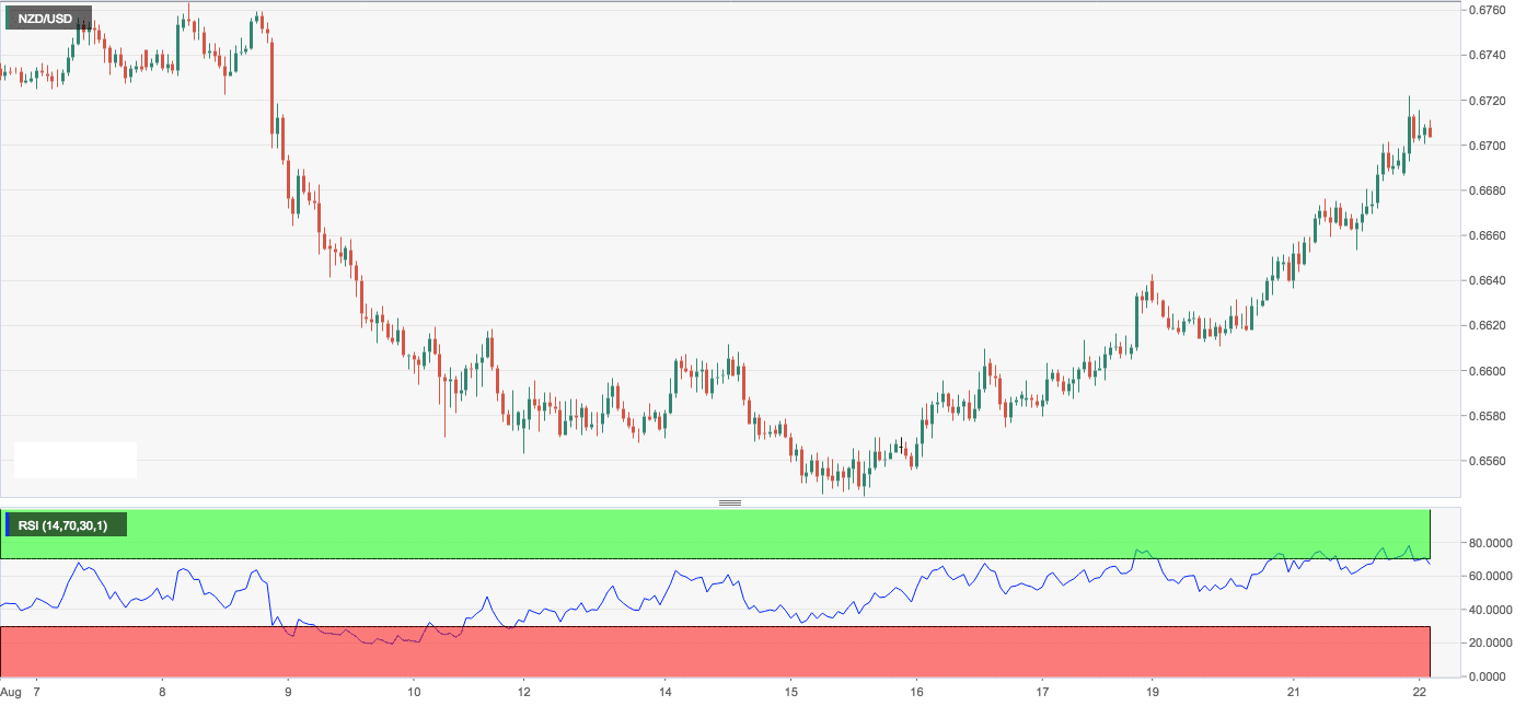 - The NZD/USD pair is flirting with the trendline sloping downwards from the April 13 high and July 26 high but may have a tough time scaling it as the relative strength index (RSI) one the hourly and 4-hour chart is flashing overbought conditions.