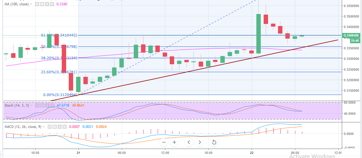 The upward roll continued past the resistance at $0.330. The decent recovery, however, came to a halt at the 50% Fib retracement taken between the highs of $0.357 and the lows of $0.3113. Subtle lower corrections were supported at $0.330. The bulls not giving up pushed for more upside movement past the 50% Fibo resistance.