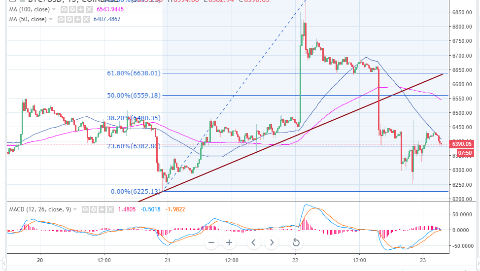 At present, the crypto is trading at $6,394 after dropping from the intraday high of $6,433.19. The buyers are seeking support at the 23.6% Fib level at $6,383.14. The technicals for Bitcoin are negative at the moment, besides the MACD is confined in the bearish zone while the gap between the moving averages continues to increase. The 50 15-minutes simple moving average is limiting gains while the nest resistance is at $6,450. There are a couple of significant support areas at $6,350 and $6,300 but the primary support is highlighted at $6,250.