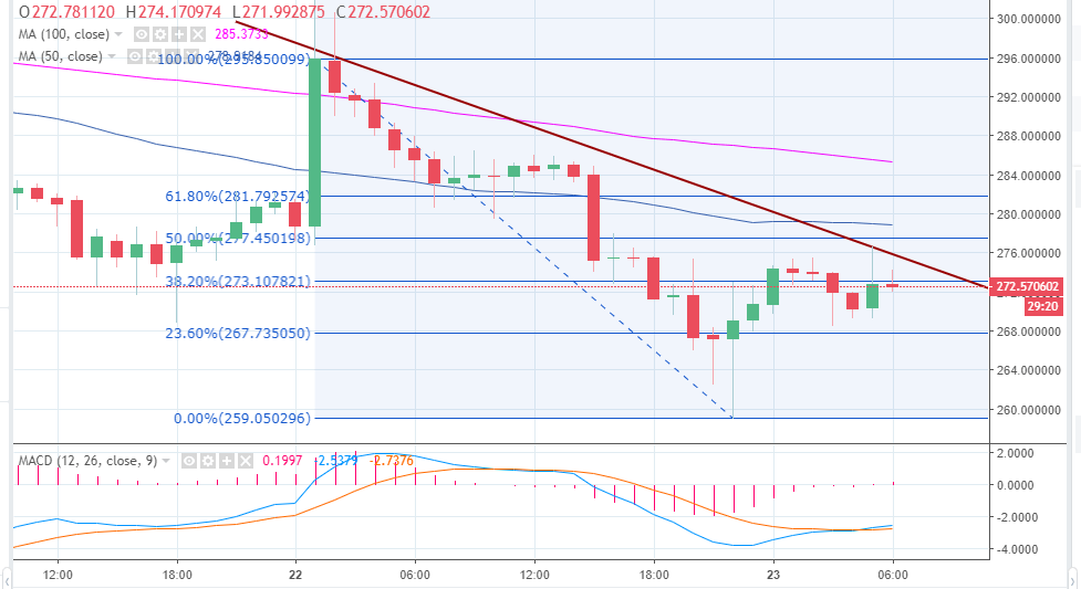 At present, the digital asset has cleared the resistance at the 23.6% Fib level with the last swing high of $295.85 and a low of $259.05 close to $268. The price has even stepped above the resistance at $272 but corrected lower on failure to overcome $276 resistance.