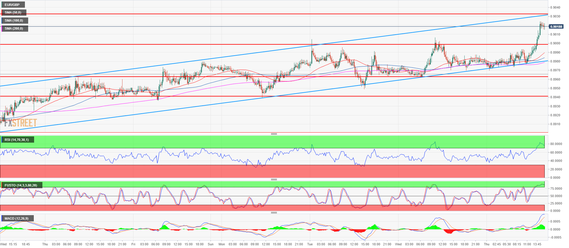- EUR/GBP is evolving in the bull channel with upward sloping simple moving averages suggesting bullish bias. The market spiked above 0.9000 resistance and is now consolidating. The next targets are located at 0.9032 and 0.9056 August 13, 2017 low.