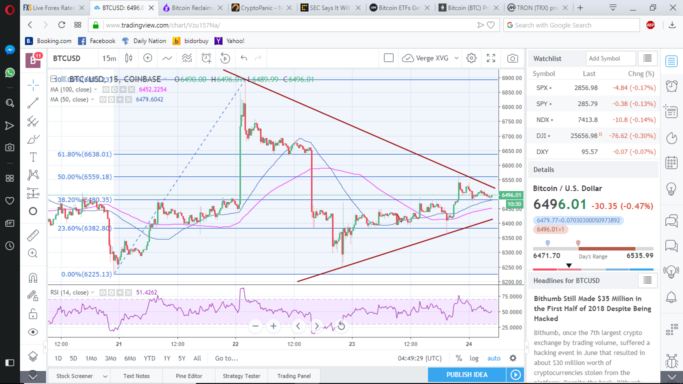 Bitcoin bulls seem to have been lured into a reversal pattern following the jump above $6,500. The price has ignored the recent predictable US Securities and Exchange Commission’s decisions concerning Bitcoin ETFs approvals. Bitcoin surged above $6,500 before culminating in a breakdown back to the levels it were at $6,400.