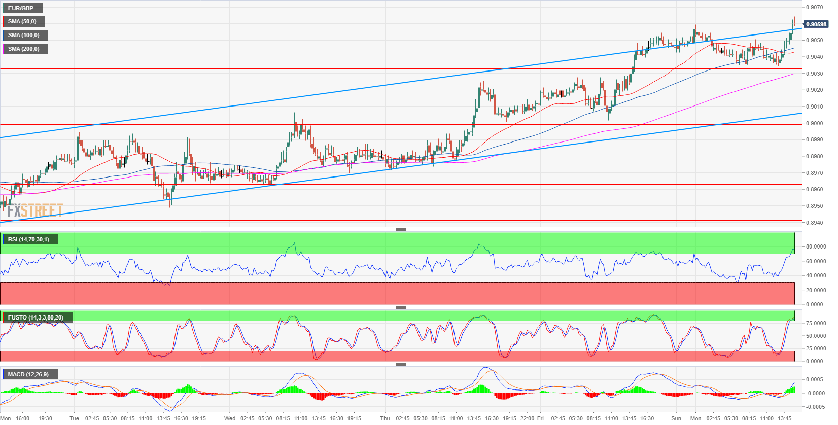 - EUR/GBP continues its ascent as the currency cross is progressing within a bull channel with rising 100 and 200-period simple moving averages. The new target is now 0.9100-0.9121 zone.