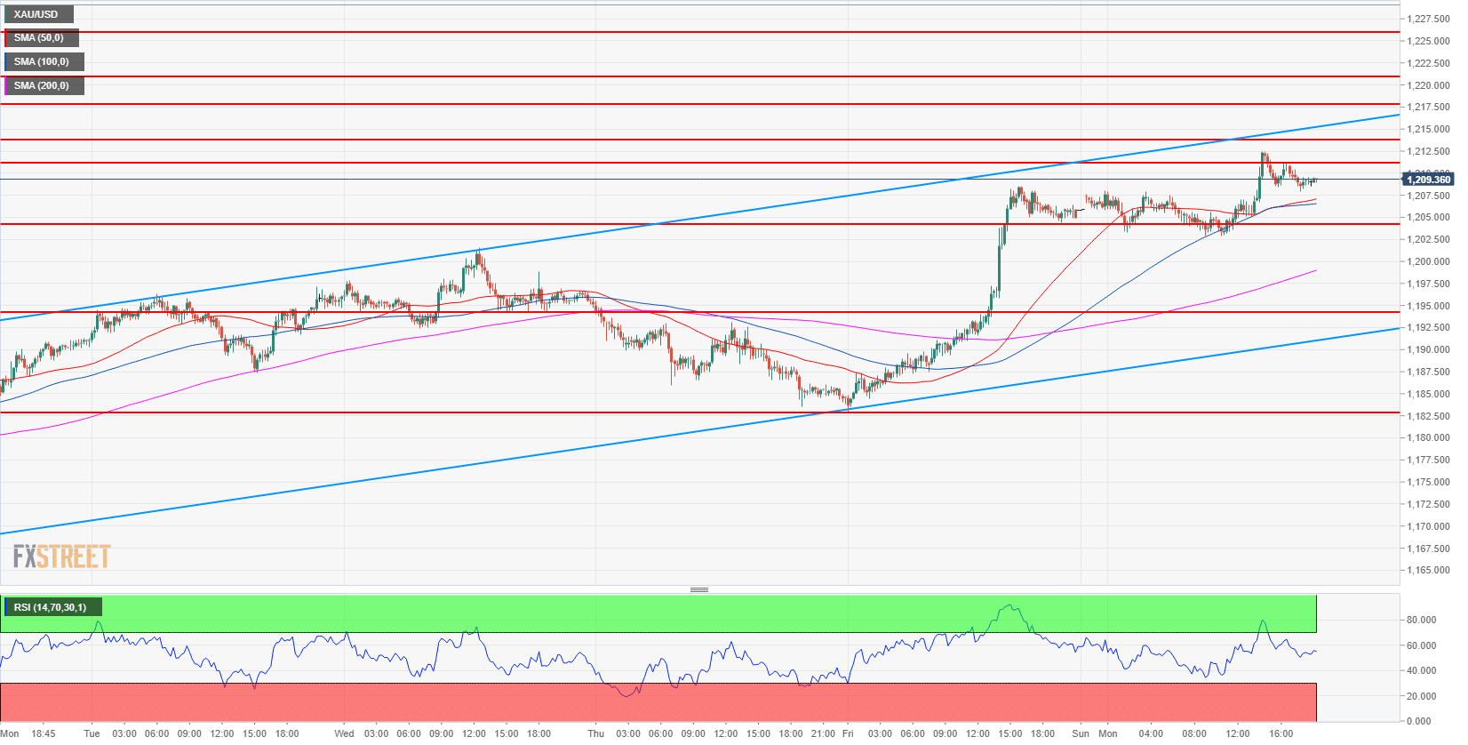 • On the 15-minute chart, gold bulls are evolving in a bull channel with a rising 200-period simple moving average. Bulls are trading above 1,205.50, August 3 swing low (key level). Targets to the upside are located at 1,213.70 (July 31 low) and 1,217.89-1,220.90 zone.