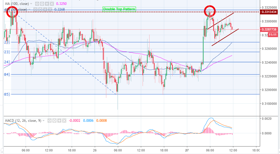Ripple has formed a double top pattern at $0.331. It is also making lower corrections in reaction to the pattern. XRP/USD is setting in a short-term bullish flag pattern support at $0.3280. The price is likely to continue moving down, for now. The MACD is in the positive territory but heading south sharply. The immediate resistance is at $0.33 while the key resistance is at $0.332 (marginally above the double top pattern).