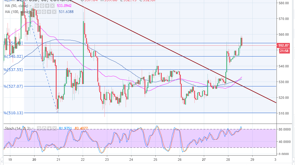 Bitcoin Cash has had a couple of lifeline support areas at $510 and $500. The trend has been sideways in the past one week with the upside capped at $540. The uptrend initiated yesterday used the support at $520 and the simple moving average support at the 23.6% Fib retracement level of the last drop from $581.91 and a low of $510.13.