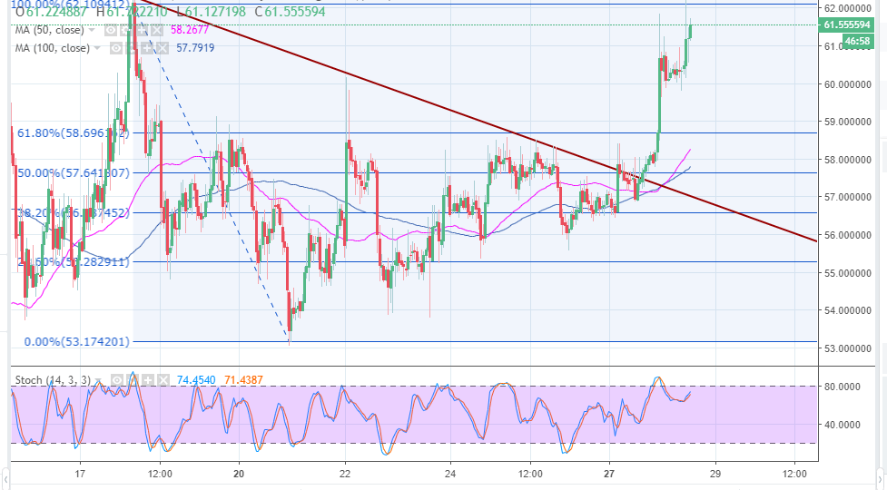 At the time of press Litecoin is trading at $61.46 after breaking above the resistance at $60.00. The digital asset has embarked on a journey of breaking barriers on the upside. The immediate resistance is at $62.00 but the buyers have their eyes on $64.00. On the flipside, there is a support at $58.00 and $56.00. Both the 50 SMA and the 100 SMA will also offer support at $58.34 and $57.77 respectively.