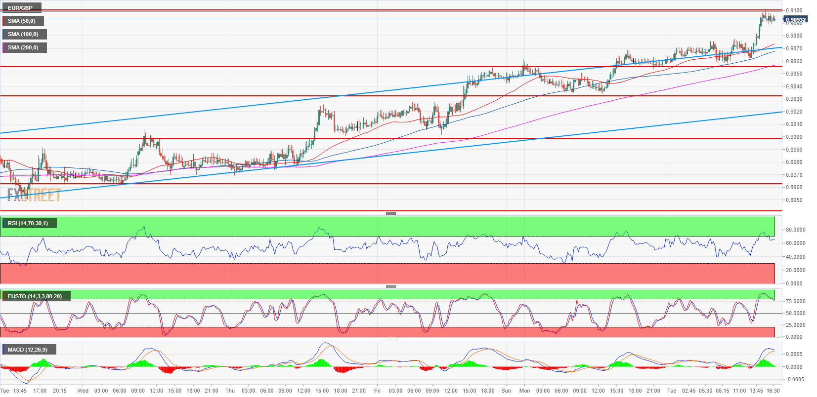 - EUR/GBP has overshot the bull channel suggesting that the buyers might have gone a little ahead of themselves. The market is likely to enter at least a sideways consolidation before resuming upward. The 50, 100 and 200-period simple moving averages are rising and widening suggesting a healthy bullish momentum. Targets to the upside are located at 0.9121 (September 10, 2017 high) and 0.9171 (September 8, 2017 open).