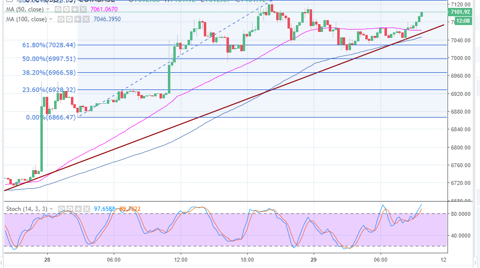 Bitcoin buyers must find a support above $7,100; this will allow them to plan an attack on $7,120 and eventually break above $7,200 hurdle. The 50SMA currently at $7,061.60 and the 100SMA at $7,046.59 will offer support above $7,000 (slightly above the 50% Fib level).