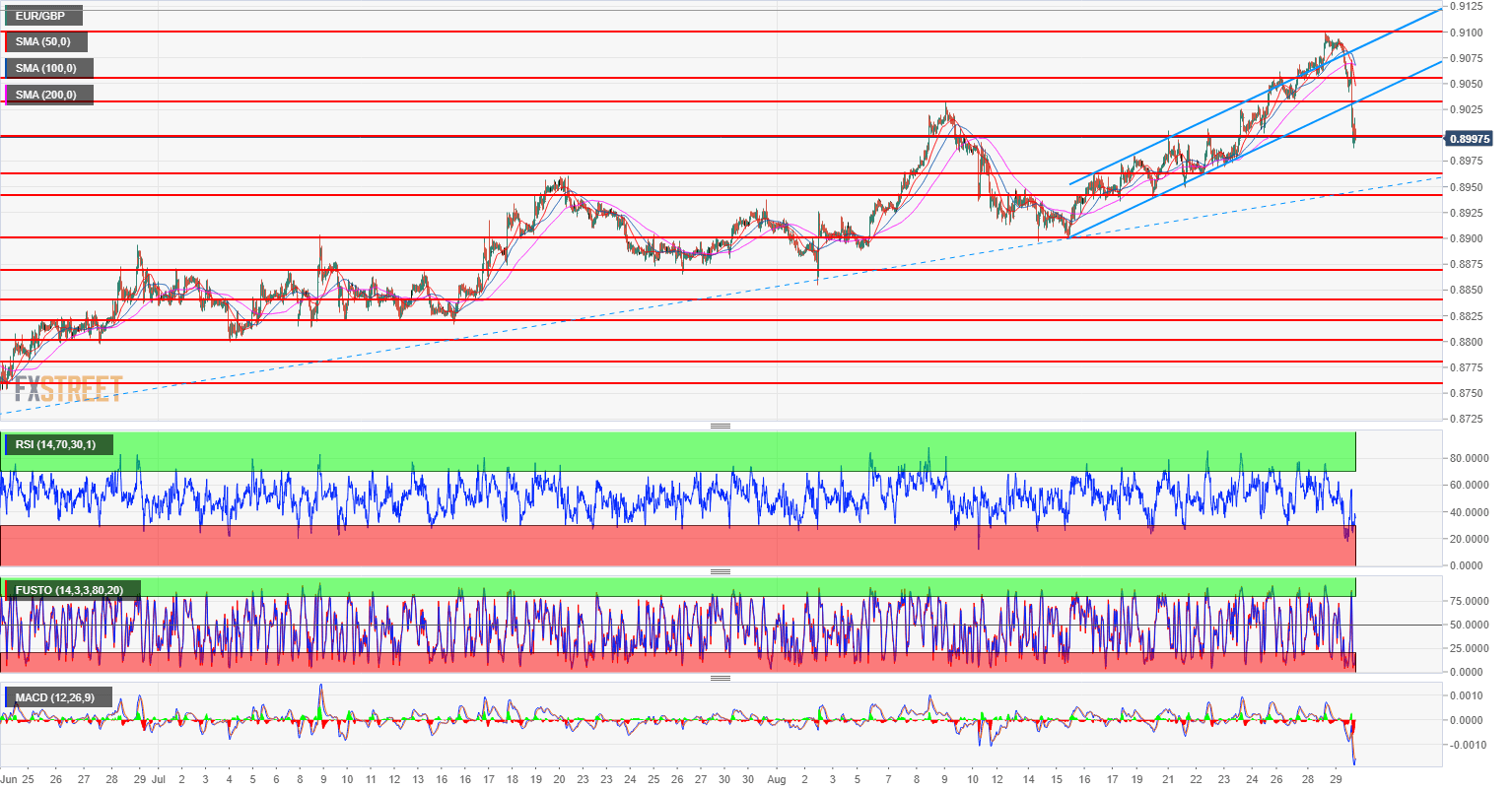 - EUR/GBP bears broke below the bull trend channel and are currently testing the 0.9000 figure.