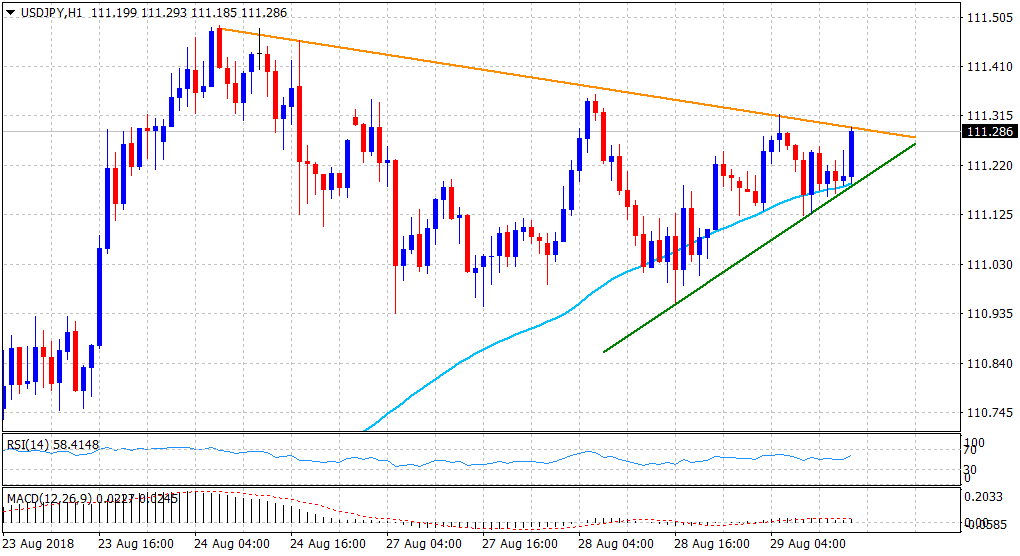 “¢ The pair extended its consolidative price action within two converging trend-lines, forming a symmetrical triangle on the 1-hourly chart.