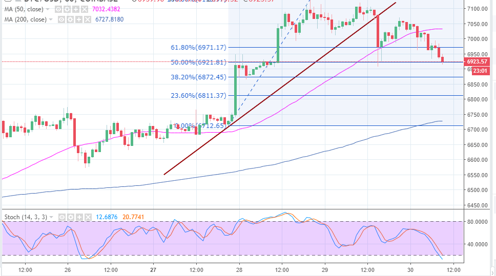 If the price slides below $6,900, Bitcoin is likely to test the support at $6,750. The trend at the time of press is highly bearish and a reversal is imminent. The path of least resistance is to the south, similarly the stochastic is moving into the oversold region. Bitcoin has to keep the support above $6,900 in order to stay away from extended declines. The resistance at $7,000 will be tough on the buyers. The second resistance is highlighted at the 50 SMA currently at $7,032.27.