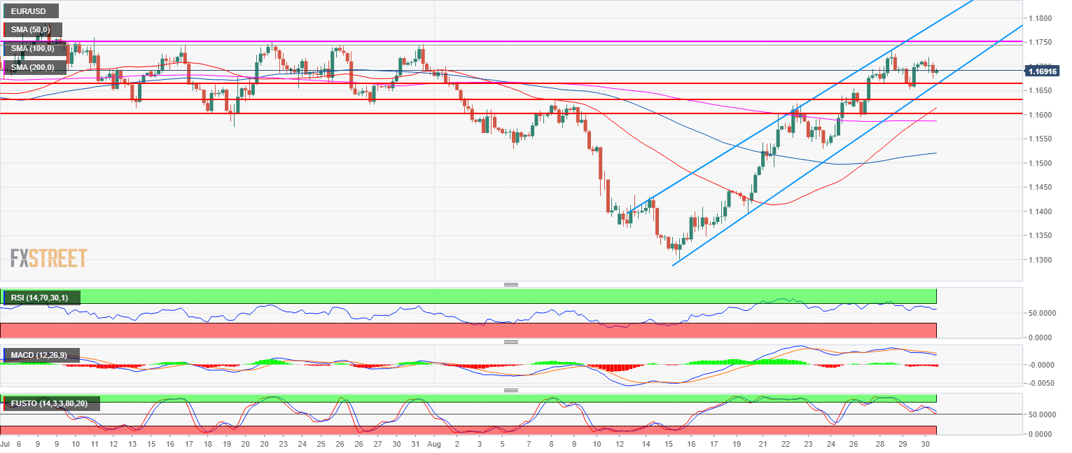 - EUR/USD is evolving in a bull channel and the market has been consolidating below the 1.1750 level for the last two days. The 1.1750 level is rather strong since it was resistance throughout the month of July.
