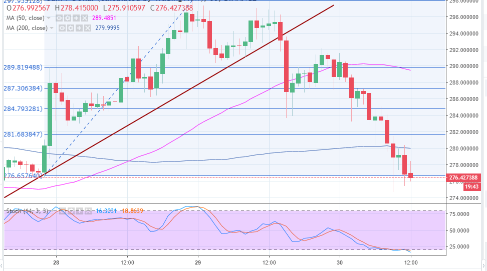 Ethereum is a down 3.98% on the day after bear reactions kicked in on failure to break above the resistance at $298.1. The bulls made a pullback after ETH/USD tested the key support at $270. The declines found a short-term bearing at $290 but continued below $288. The support at $282 – $283 has also been broken. Ethereum is currently testing the next support target at $276. Declines towards $270 are possible unless the buyers can push the price above $280 in the short-term.