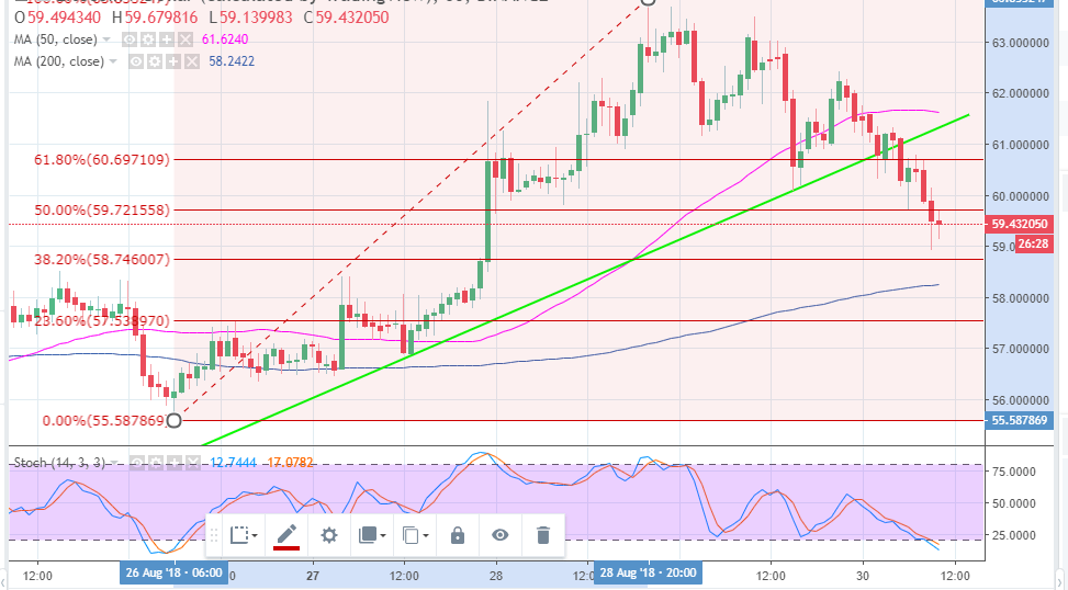 - The short-term support at $59.00 is vital but the hourly 100 SMA will offer support at $58.23.