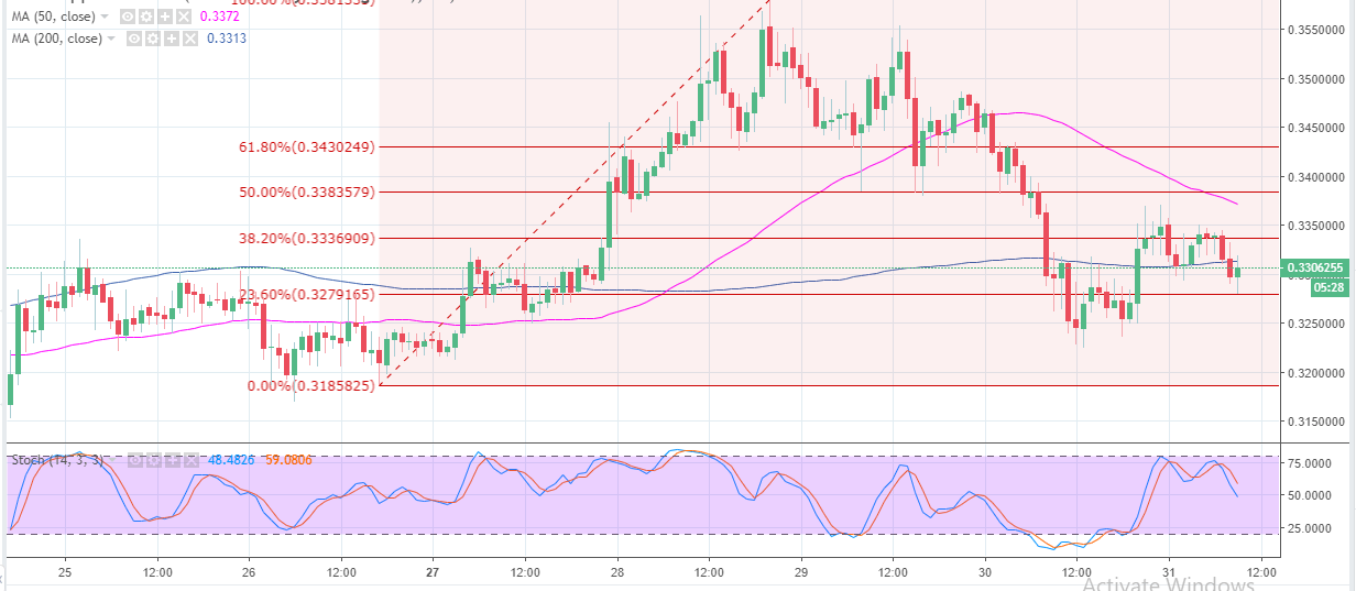 Ripple price broke the support at $0.330 as covered in the analysis published by FXStreet yesterday. As predicted, XRP/USD moved further down sliding marginally below the next support target at $0.325 before the bulls entered, There was a decent recovery that stepped above the 38.2% Fib retracement level with the last high leg of 0.3581 and a low leg of $0.3185. The bullish trend hit a dead end at $0.3350 and began correcting lower.