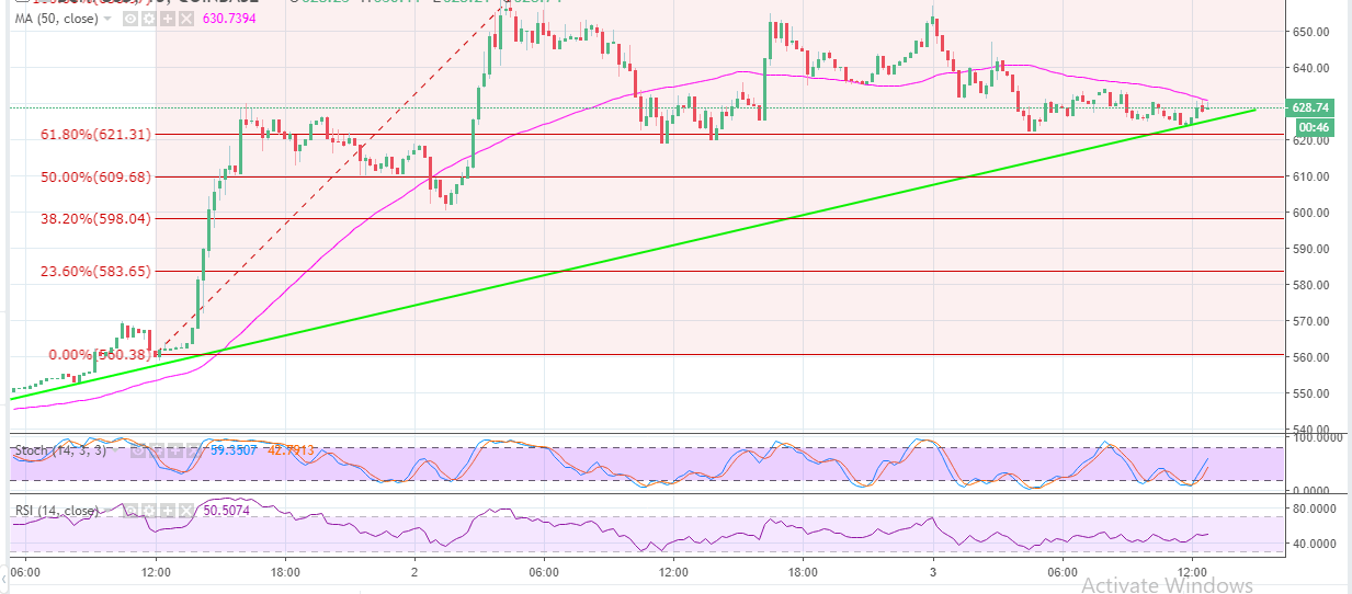 There are several lifeline support areas that are likely to keep BCH/USD above $600. The support areas range from the 61.8% Fib level with the last swing high of $658.97 and a swing low of $560.38 to $600 but $610 is substantial support area. The buyers are consolidating gains above $600, but Bitcoin Cash is currently trading at $629.