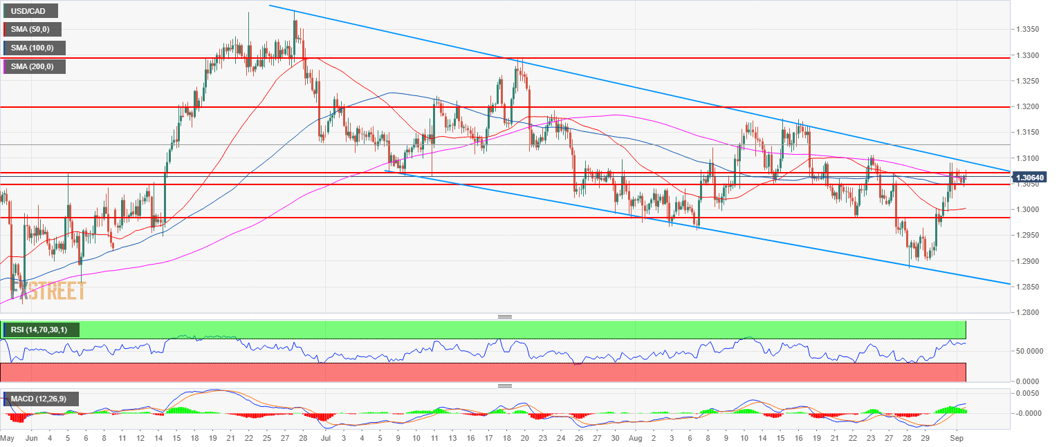 - USD/CAD bulls objective is to breakout above 1.3100 figure and the bear trendline. The RSI and MACD indicators are supportive of higher prices.