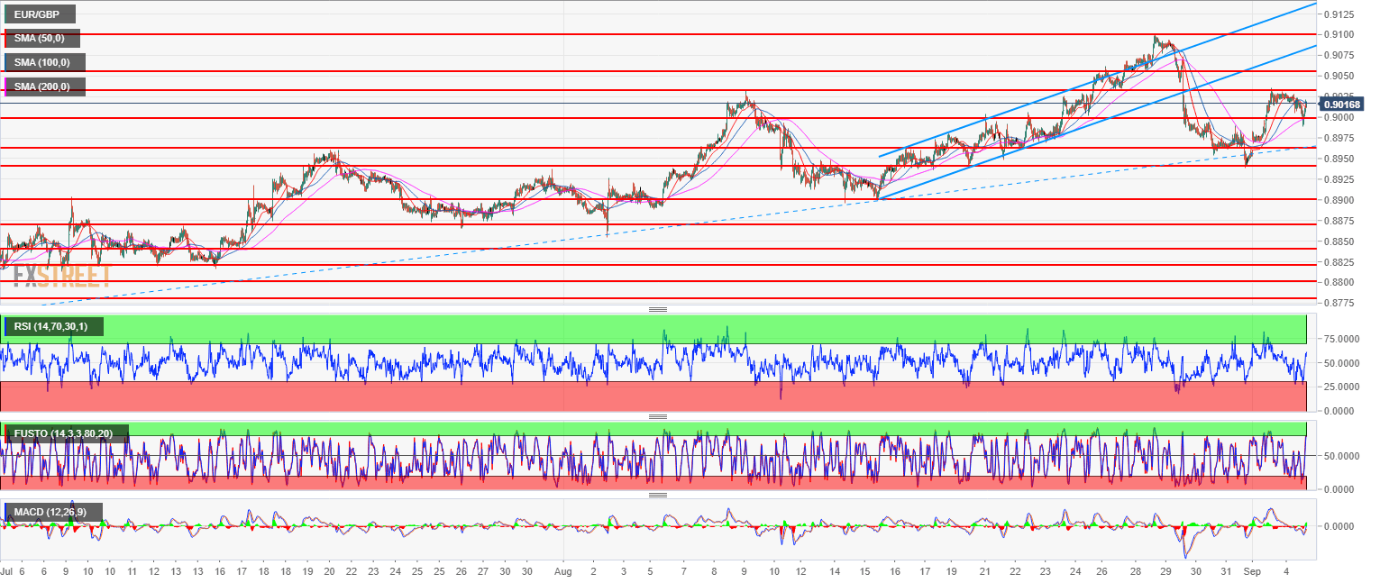 - EUR/GBP is trading above the 0.9000 figure and the 200-period simple moving average, confirming the bullish bias. The next targets to the upside are located near 0.9056 (August 13, 2017 low) and the 0.9100 figure.