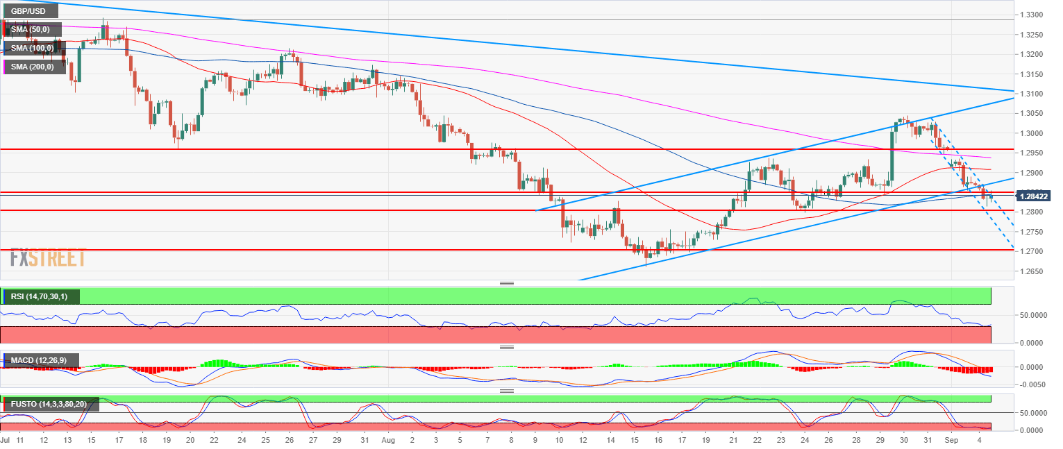 - GBP/USD has found some support just above the 1.2800 support and a break below the level is needed to confirm the continuation of the bear leg.