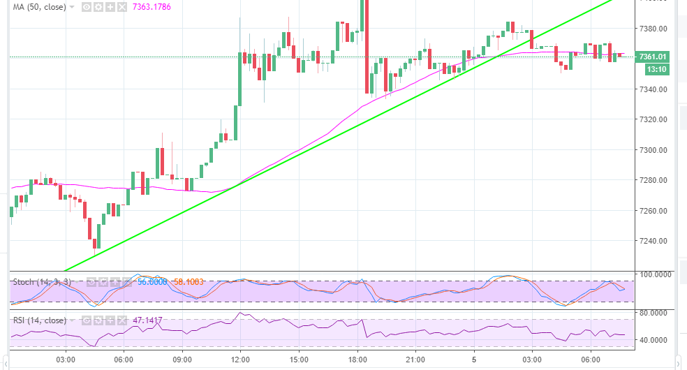 In the meantime, Bitcoin is trading below the trendline support at $7,373.02 but the buyers are battling for recoil above $7,370. The stubborn resistance at $7,380 must be cleared for a clear path towards $7,400 to come to light. Bitcoin buyers must find a support above $7,400 in order for them to avoid the frequent dips towards the short-term support ($7,340). The stochastic and the RSI are ranging signaling that the trend will be upwards sideways in the short-term. A couple of critical supports exist above $7,000 at $7,300 and $7,200.