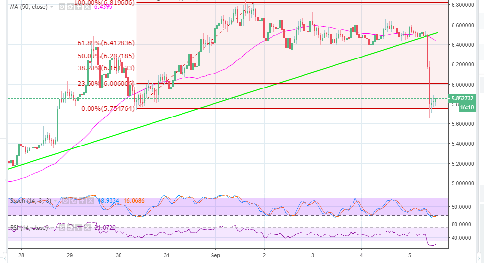 It is as if the bulls were dancing at the edge of a high cliff and the bears’ slight poke sent the price spiraling like deadweight in the air. Further breakdown broke the support at the 23.6% Fib level at $6.00. The buyers entered at $5.65 (September low), besides EOS is seeking support at $5.80. There is a weak bullish trend ongoing on the chart but selling pressure is too high to allow significant upwards movement to the resistance at $6.00. The sellers seem to be exhausted as the technical signals turn positive (slightly) and buying entries are bound to increase at this positioned.