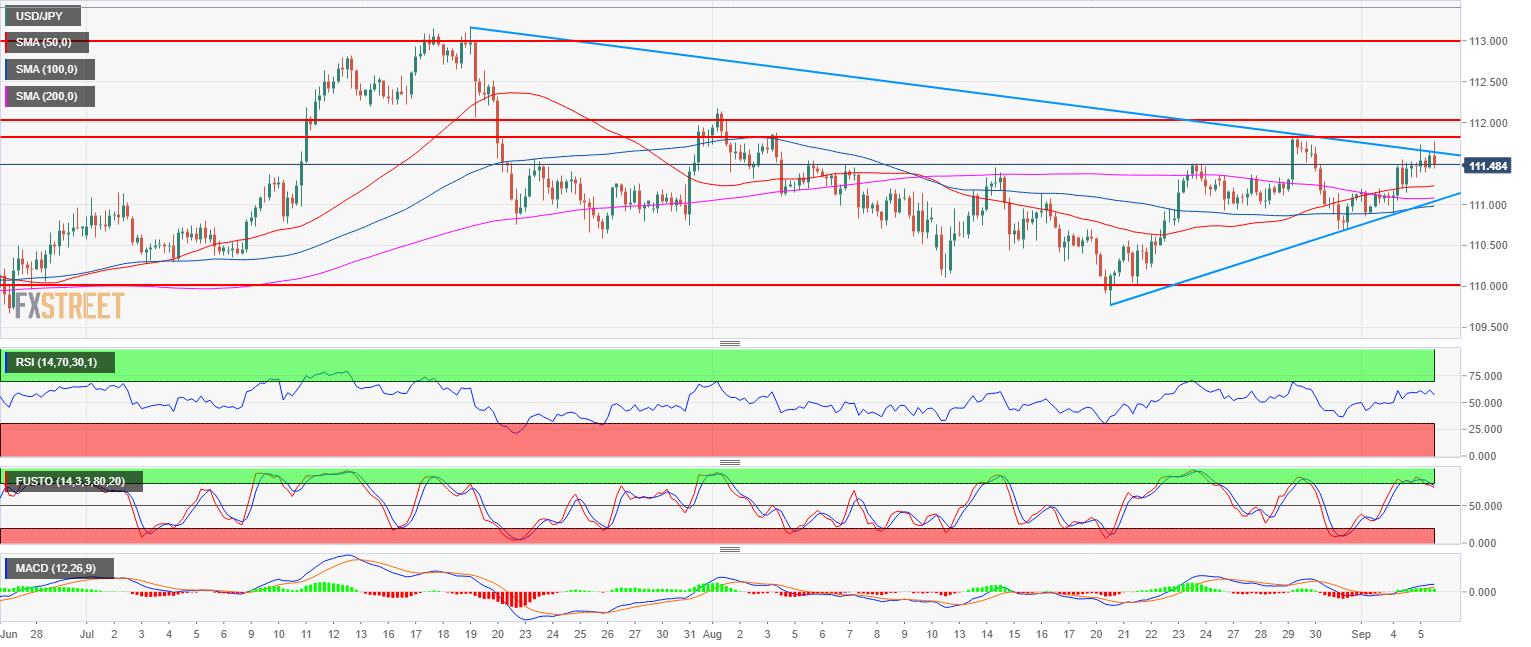 - USD/JPY is trading above its main simple moving averages (bullish) but below a bear trendline capping for the time being the bullish advance. USD/JPY is also printing a small double top with August 29 swing high at the 111.84 level