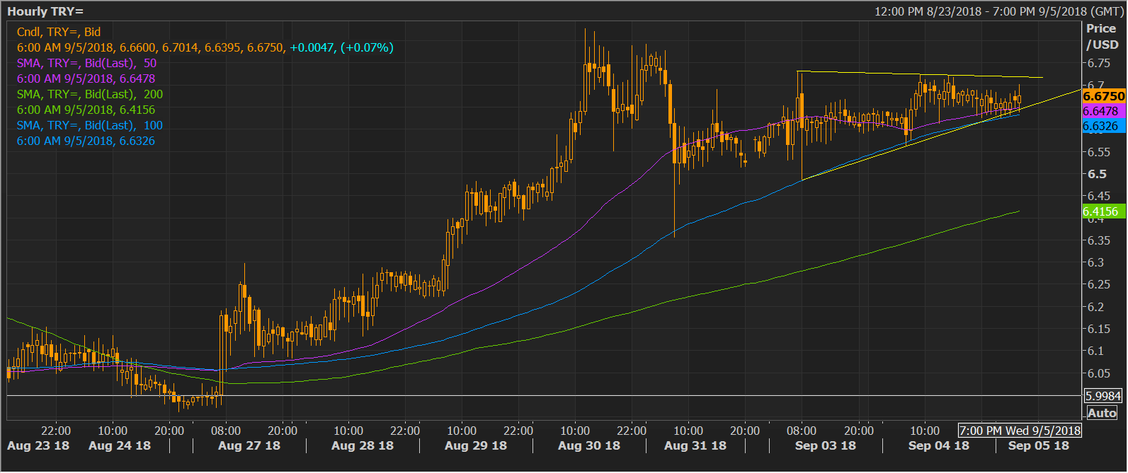 - The USD/TRY pair has charted an ascending triangle, a bullish pattern, on the hourly chart.