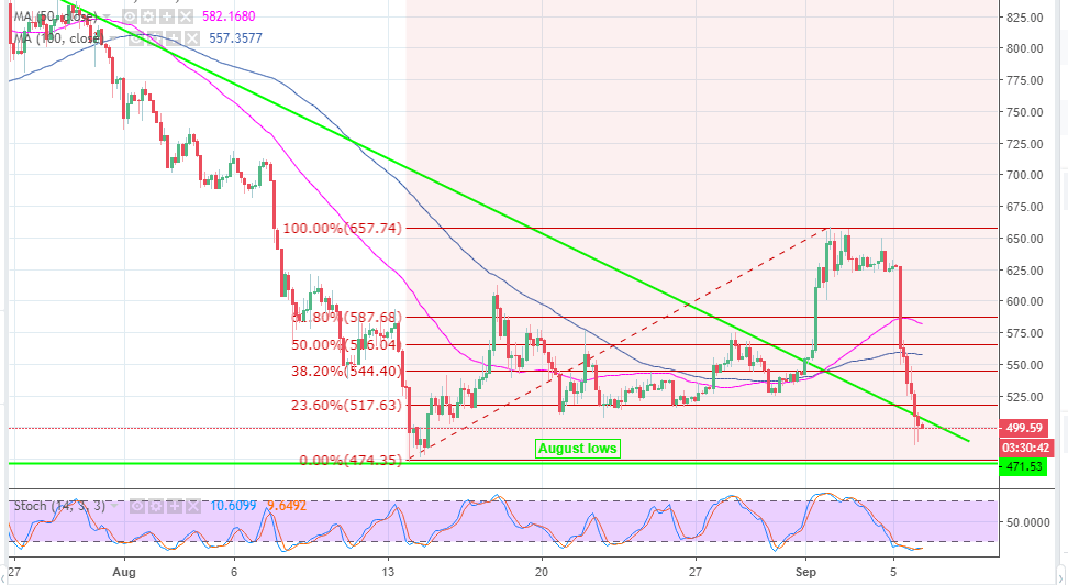 The market is bleeding and this time the fall is unstoppable, especial for Bitcoin Cash which has plunged from trading above $650 and is now seeking refuge slightly below $500. Bitcoin Cash bulls were taking a breather following a recovery that occurred after the August declines that saw BCH/USD test the support at $470 while heading to $450. The price broke above the bearish trendline that started from the highs on July 17 and July 24.