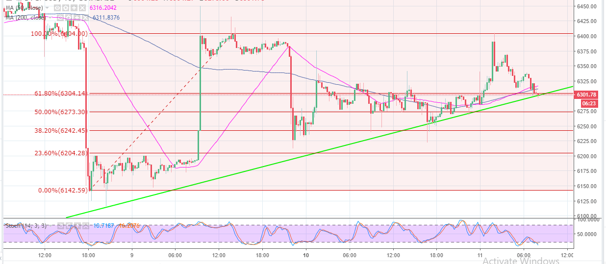 Bitcoin price has recovered from the monthly low traded over the weekend. However, the trend is still in the favor of the bears who are not ready to give up control any time soon. The buyers pulled back the price above $6,400 on Sunday 9 but they lost momentum allowing the sellers to cancel the gains towards $6,200. Since the week began, upside movement has been limited below $6,400 while the downside has been protected by the bullish trendline (15-minutes chart).