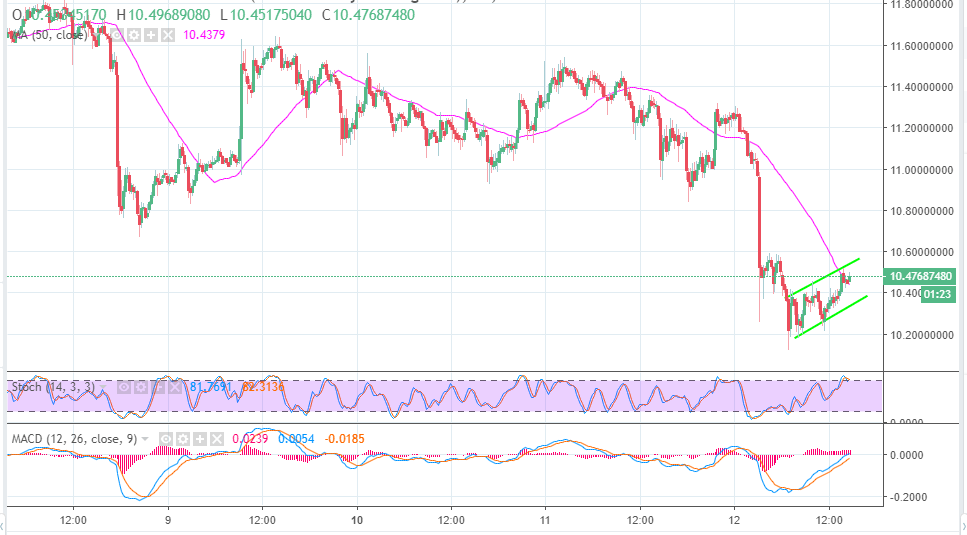 The price is nursing the losses in a bearish flag pattern which is embracing the support at $10.20. However, the digital asset is dancing at the edge of a cliff waiting for a fall and this time the support at $10.00 might not be able to hold. Significantly, this can be avoided by the buyers finding a support above $11.00 and later swing higher towards $12.00 and eventually $13.00.