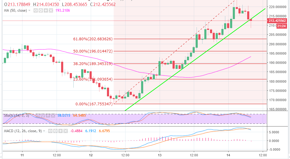Ethereum added over 10% on Thursday in addition to a break above $200. The trading on Friday has been bullish since the Asian trading hours. Similarly, ETH/USD approached $220 but corrected lower on failing to jump above the level. The price has been using the trendline as a support since the bounce that began around $170. If the trendline support is broken at $212, Ethereum is likely to cancel the gains.