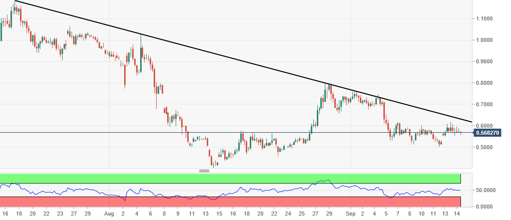 IOT/USD is down about 0.7 percent on day at $0.567, hanging at the middle point of the day. On the 360-minute chart, there is a room for some more bounce upto $0.60-$0.62 where it meets strong resistance in the form a descending trendline, making prices take a U-turn from there.