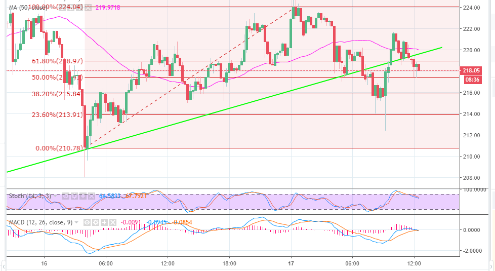 The cryptocurrency market is mixed red and green. Ethereum is trading in the red at the time of press. It is down a subtle 0.66% on a daily basis. During the Asian trading hours, the crypto corrected higher above $220 but turned bearish trimming the gains on reaching $225. The lower corrections broke the trendline resistance but found balance at the 38.2% Fib level between the highs of $224.04 and lows of $210.78. The price tested $241 but the buyers pushed against the bears where Ethereum trade briefly above both the trendline and $220 resistance levels. At the moment, Ethereum has declined again and is trading at $218. The bulls have a stronger grip but they lack the catalyst to sustain upward movements.