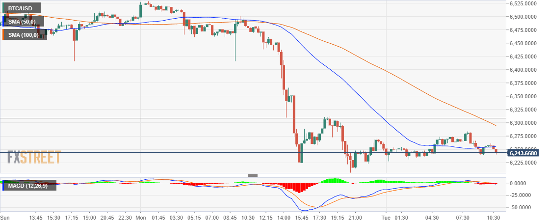 The trend is generally bearish but the MACD is ranging at the mean level (0.0). On the upside, the 50SMA currently at $6,255.58 (hourly) is limiting gains. Moreover, the 100SMA will hinder movement at $6,295.3. On the other hand, the support at $6,200 must be defended by all means. Otherwise, Bitcoin could test $6,000 as well as the major support at $5,800.
