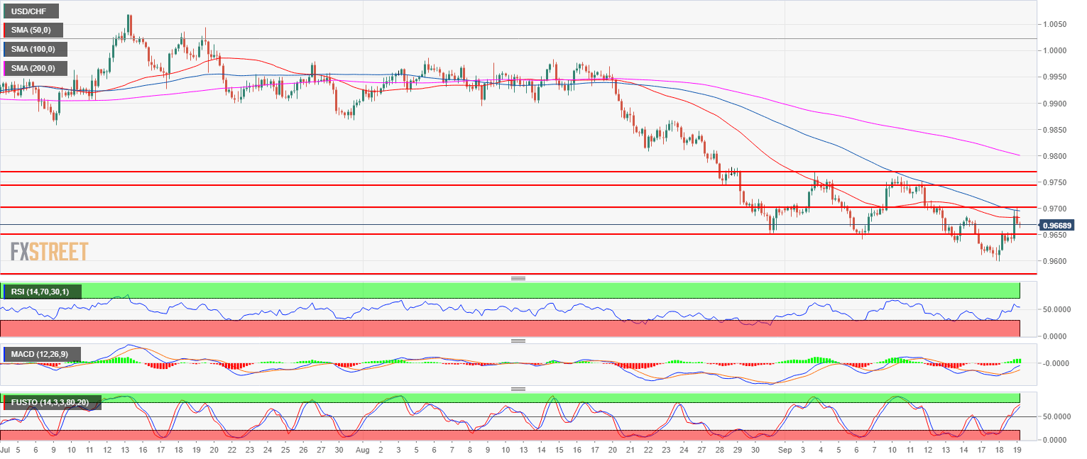 - USD/CHF has rebounded from the 0.9600 figure and is now in consolidation mode between the 0.9700 and 0.9650 level.