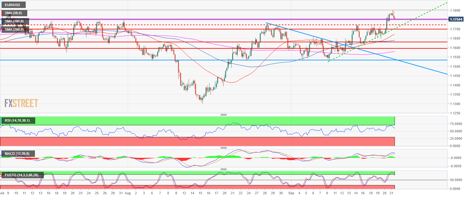 - EUR/USD is currently consolidating the recent gains as the bears are trying to push EUR/USD below 1.1750 key level. The market is set to trade down towards 1.1722 (last week high) and 1.1700 figure.