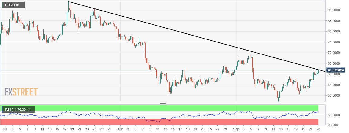LTC/USD is up 2 percent on day at $61.85, just around the high of the day and exactly around the resistance descending trendline on the 480-minute chart which would require a lot of push and momentum to cross, just as the RSI nears oversold zone.
